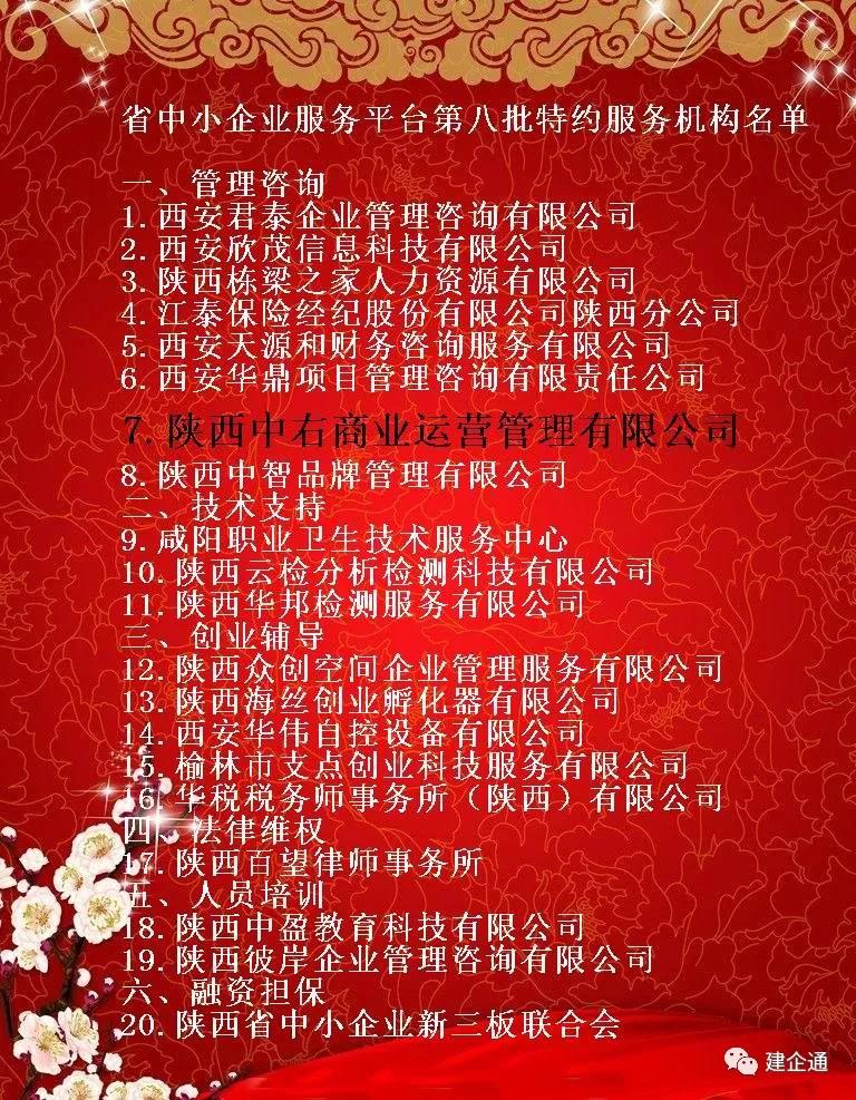 根据《陕西省中小企业服务平台管理办法》(陕中企规发〔2012〕6号)的要求,经有关部门和行业协会推荐、服务机构自主上报,陕西省中小企业服务中心组织实地考察、评审和公示,现确认西安君泰企业管理咨询有限公司等20家服务机构作为省中小企业服务平台第八批特约服务机构: